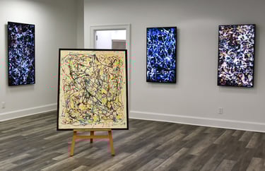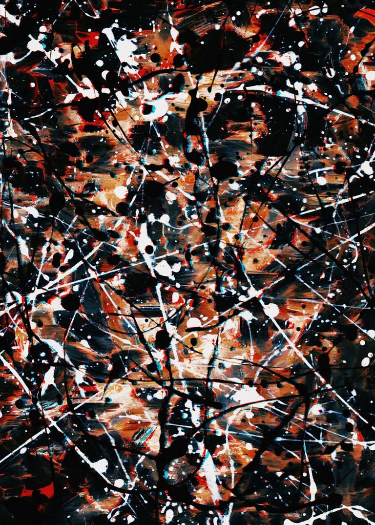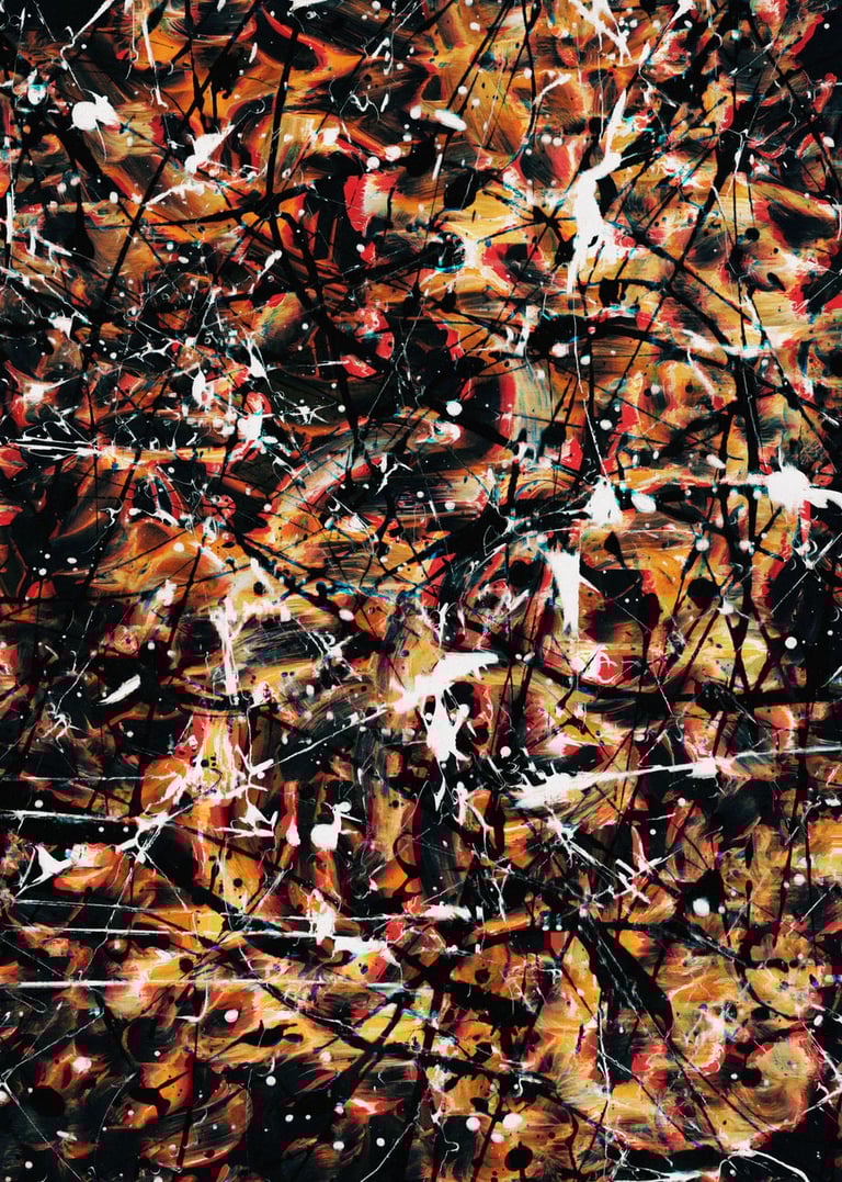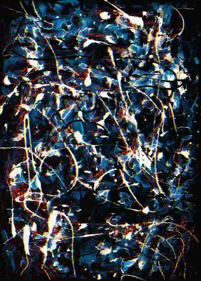 Expressive drip and finger paintings scanned and combined, each created in response to and exhibitied alongside an attributed Jackson Pollock painting for the Exchange Art Gallery opening exhibition in the Hamptons, NY 2022. Inner Turbulence explores a frantic state of mind, with the physical-to-digital process allowing me to not only express emotions physically, but later re-experience, connect and enhance them from a new perspective digitally. This series is dark, personal and chaotic – reflective of our turbulent minds and pays homage to Pollock’s own mental struggles which he endured throughout his career and life. Read more about the series here.